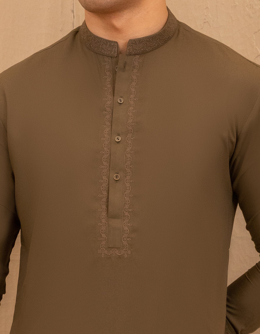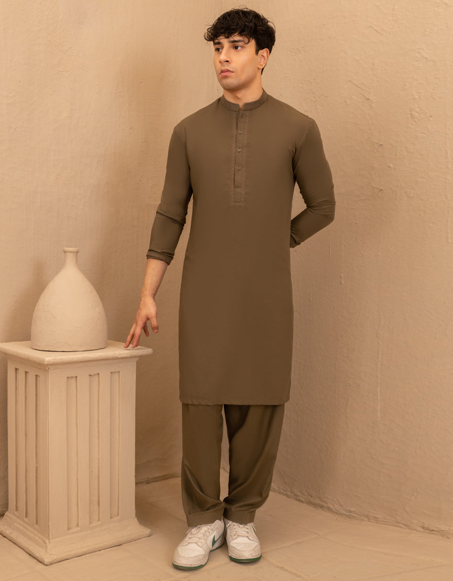 Designed with the young gentleman in mind, this olive green blended semi-formal kameez shalwar exudes charm and sophistication. Its classic yet stylish look offers versatility, perfect for both casual and formal occasions.