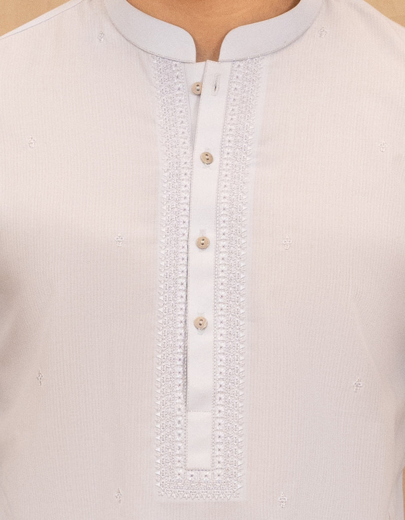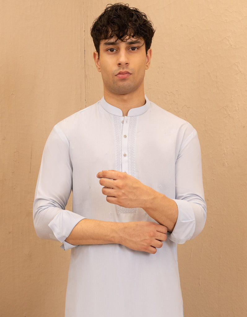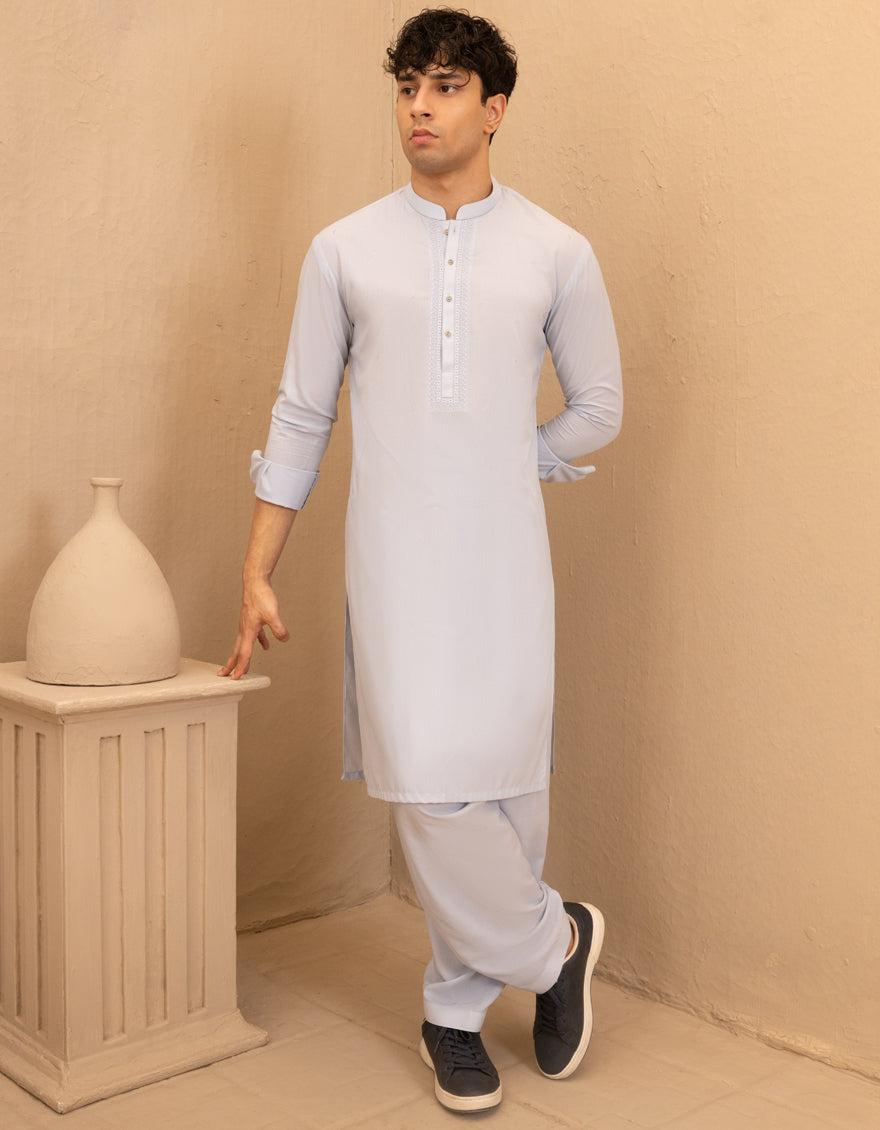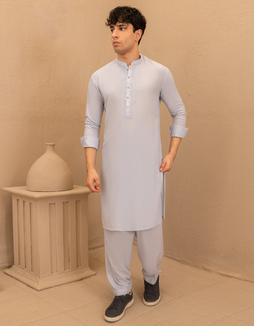 Traditional and simple, this sky blue blended casual kameez shalwar is made for comfortable daily wear and relaxed occasions.