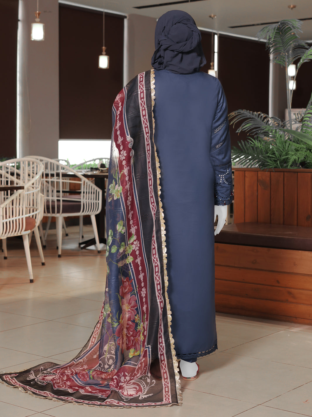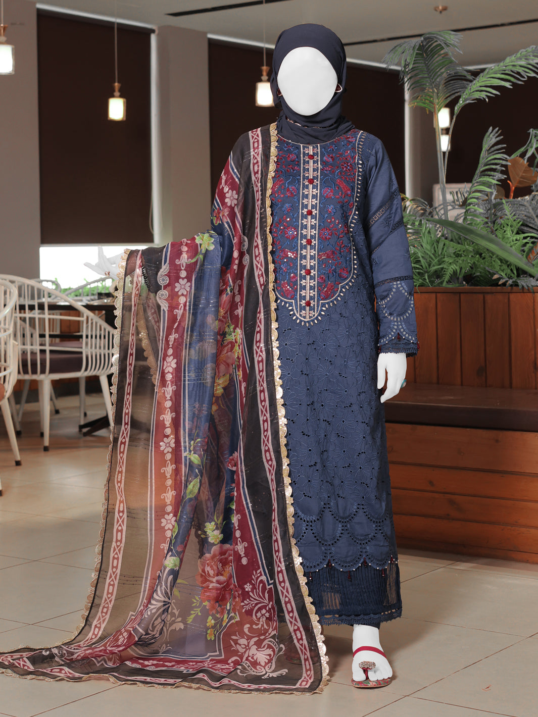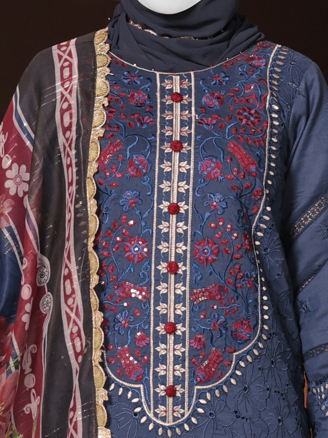 The dress has detailed schiffli embroidery on the front, adding a touch of luxury and traditional craftsmanship. The embroidery is likely done in contrasting color neckline with sequence touch to stand out against the blue background, adding texture and depth to the overall design.