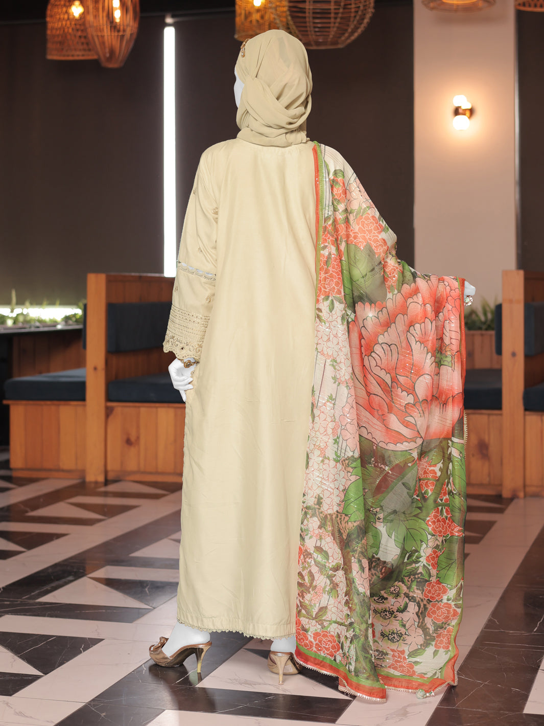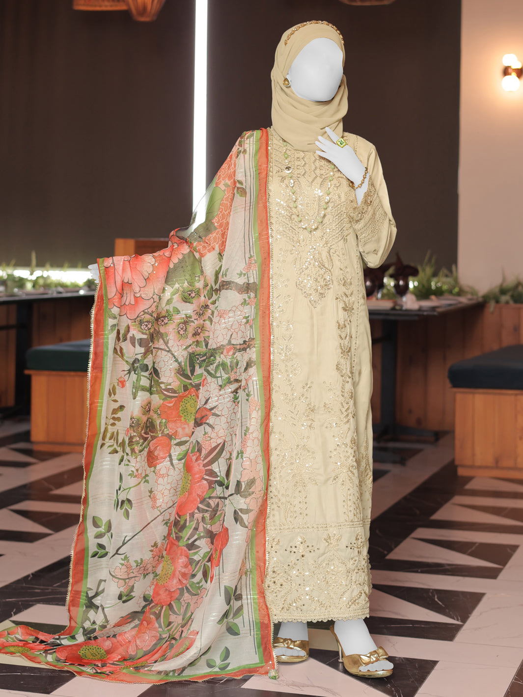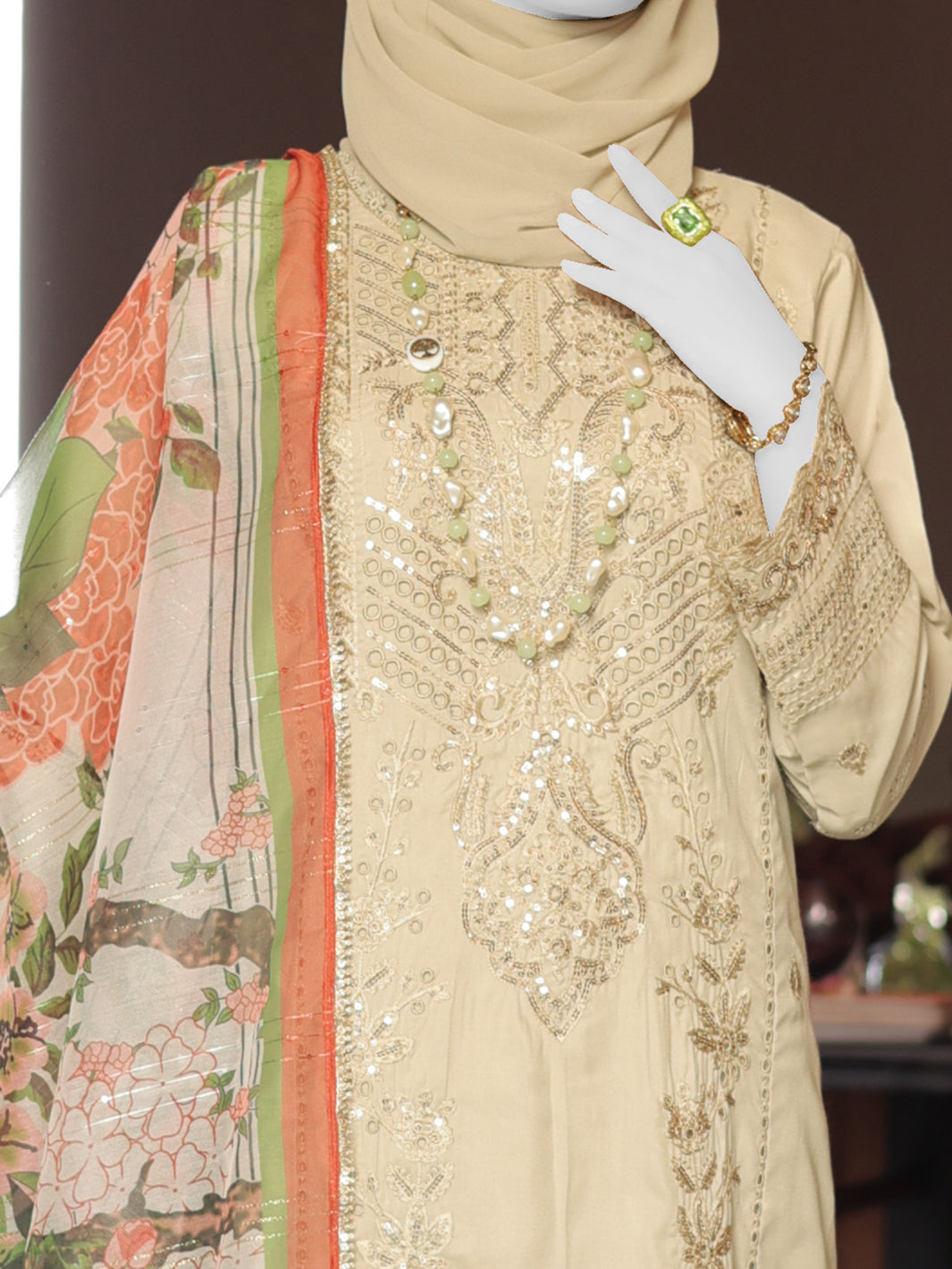 Candle light is a pale gold-hued attire crafted from twisted fabric. The shirt features modern chickenkari embroidery motifs with light gold sequins work making it a true piece of art.